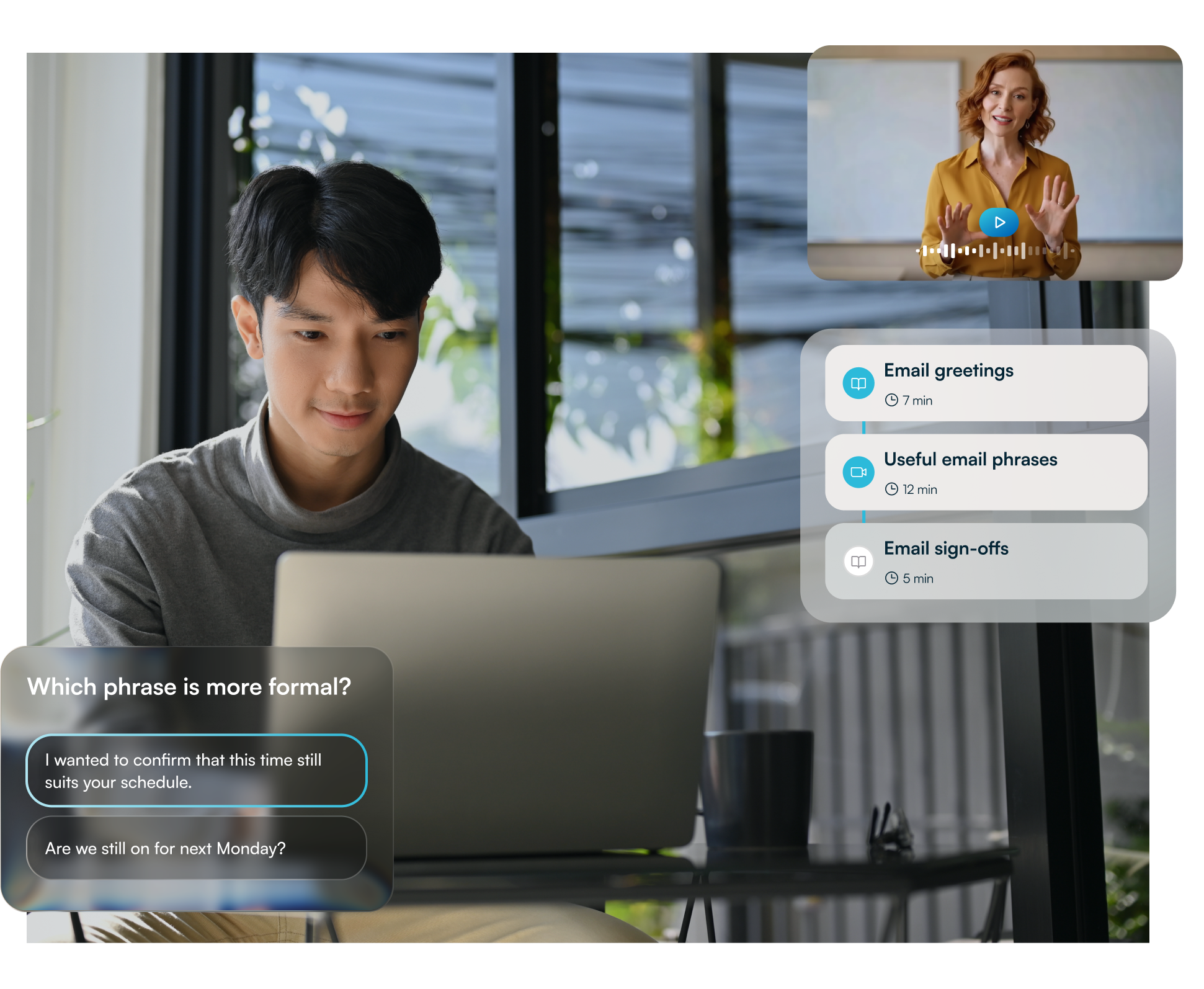 Focused lessons that give structure, language, and examples for common scenarios, like meetings, writing, or presentations.