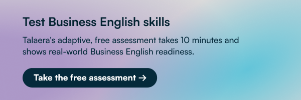 You can test your current Business English skills with Talaera’s free 10-minute assessment to understand your real-world communication readiness, or sign up today to practice with Talk to Tally, our AI coach providing on-demand speaking practice and real-time feedback.